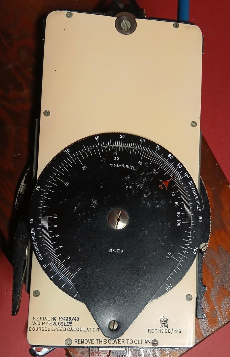 WW2 Era Stores Air Ministry Pilot's Course & Speed Calculator Stores Reference 6B/125. By W. G. Pye & Co. Ltd. Metal construction with sliding scale for airspeed and scales to allow for drift and distance etc. Shows light use and wear but is in excellent overall condition. 1940 date code. In the original felt lined wooden transit case. This shows light wear and use with some moth damage to the felt lining. Twin clasp closure and single leather carrying handle. Stencilled with manufacturer's markings and reference details to one end. Used by Navigators to calculate their routes.