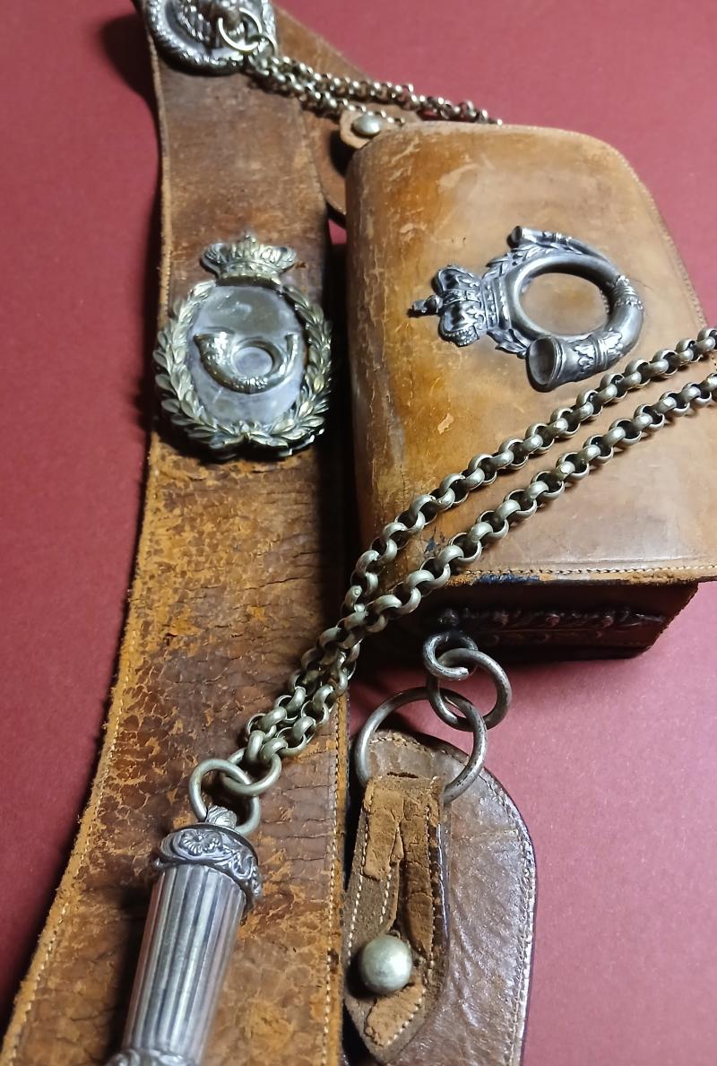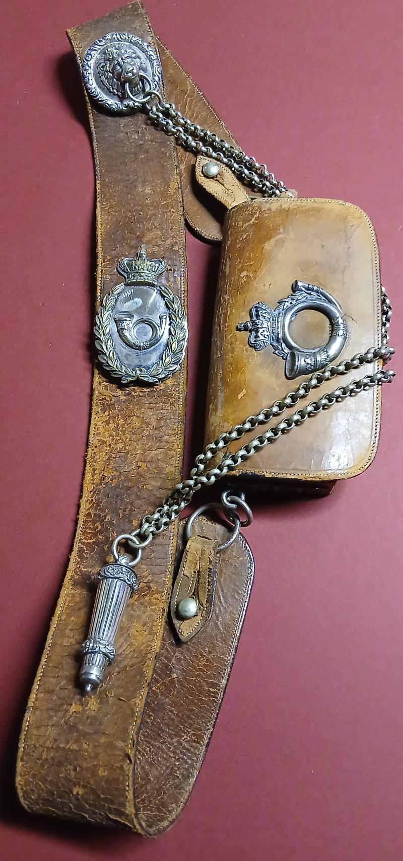 Brown Leather shoulder belt together with cross belt plate and Inkermann whistle & lions head boss and chains. The revers having a fitted pouch with regimental device.