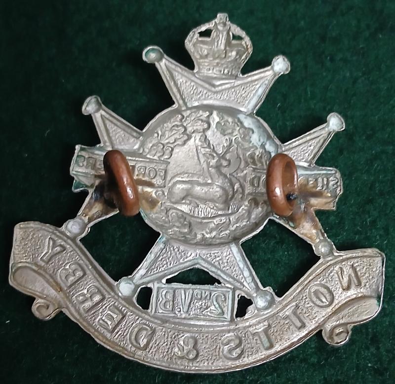 . (SHERWOOD FORESTERS) 2ND VOLUNTEER BATTALION VOLUNTEER PATTERN cap badge c1905-08 A good scarce die-stamped white metal example on loops HQ originally at Bakewell moved to Chesterfield in 1898