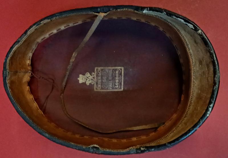 the blue cloth body with a narrow gold lace cord around the crown, the drooping peak with inlaid gold wire, the patent leather crazed. silk lining and buff leather sweatband.