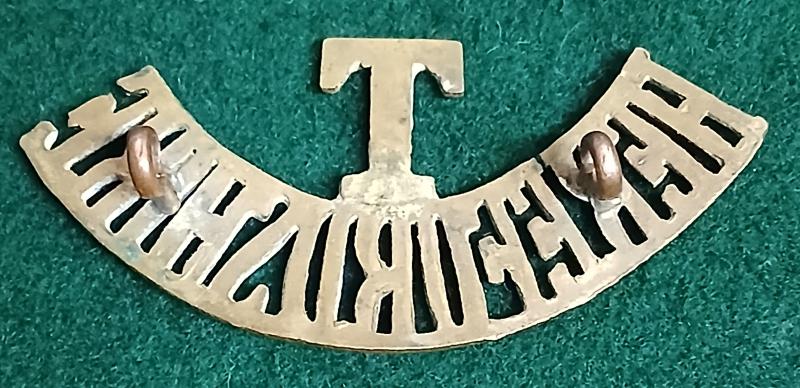 . Territorial Battalion shoulder title A brass one piece shoulder title. Two loops to the reverse. VGC. Westlake 1576...