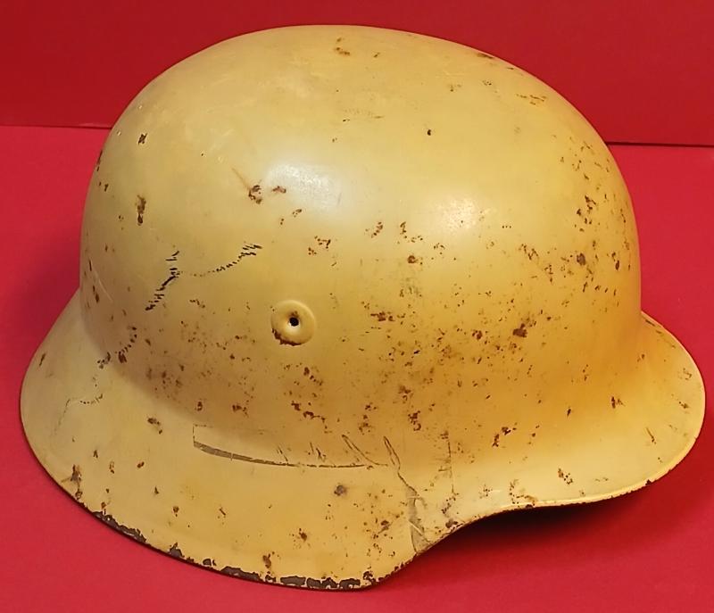 . Desert colour Scheme. early paint. Size 64. maker mkd. Stamped vents. fitted with fireman's type leather lining No chin strap. Rare variant