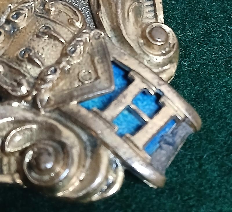 A Very large regimental shoulder belt plate with gilt backing plate, red velvet within crown and blue enamel behind diagonal scroll.