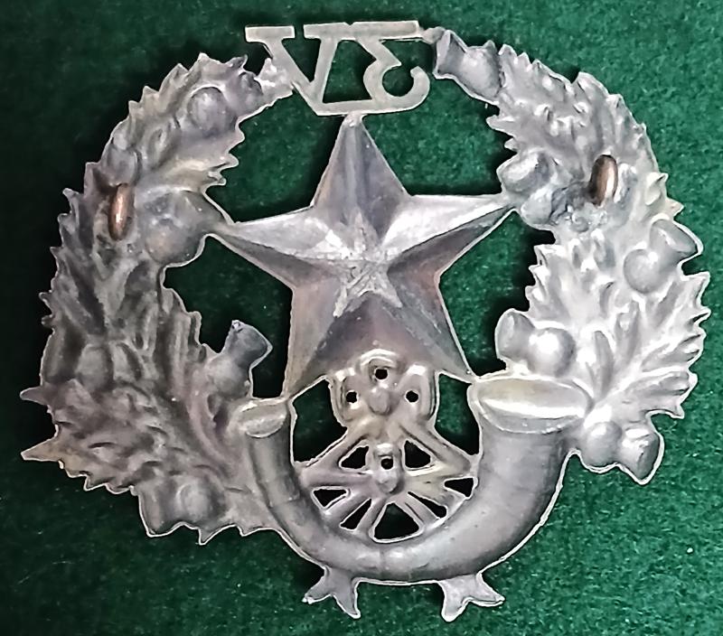 The Mullet and bugle horn surmounted by, " 3 V" within a wreath of thistle. Worn by the 3th. {South Glasgow} Volunteer Battalion of the Cameronians {Scottish Rifles}