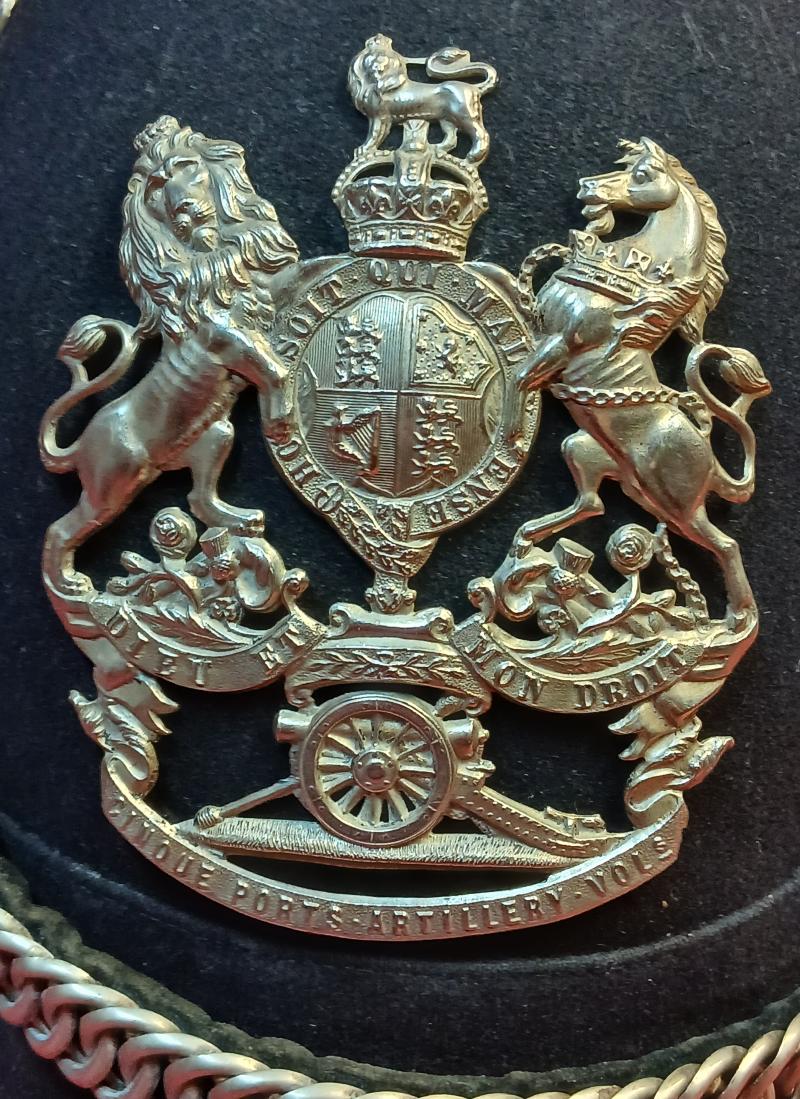 Blue cloth Helmet covered skull with white metal mounts, pierced Kings Crown Royal Arms helmet plate bearing the regimental device surmounting the regimental title CINQUE PORTS ARTILLERY VOLS, spherical finial with quatrefoil base, rosette bosses,