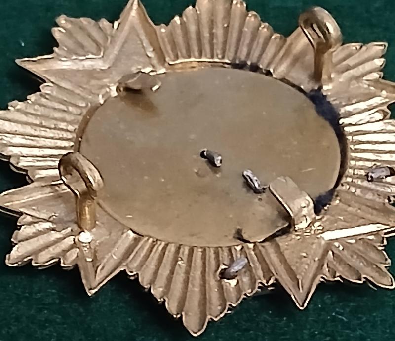 A gilt metal a Maltese cross upon an eight pointed star. On the Cross the Garter with motto; within the garter a Hart crossing a ford in silver, A silver scroll inscribed “Bedfordshire” below the Garter.