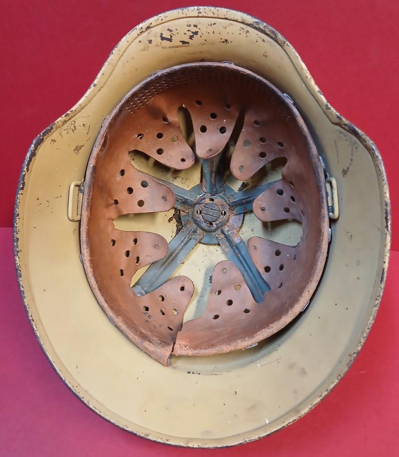 . Desert colour Scheme. early paint. Size 64. maker mkd. Stamped vents. fitted with fireman's type leather lining No chin strap. Rare variant