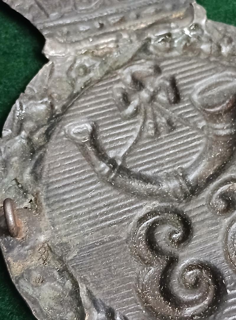 . THE WEST SUFFOLK ALBERT PATTERN SHAKO PLATE 1844-1855 CRIMEA WAR PERIOD OLD REPAIR TO CROWN AND CRACK TO RH LUG