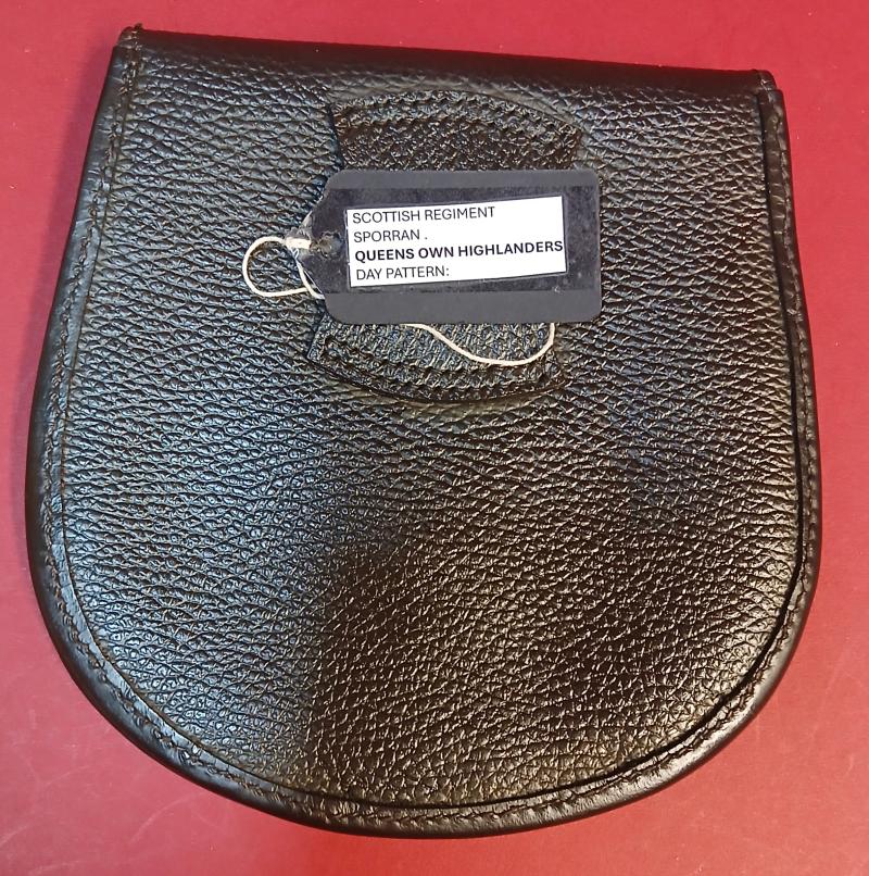A Scottish Regiment day sporran (military pattern) is a rugged, utilitarian, and plain dark brown leather pouch, featuring regimental badge, a bellowed construction, and a stud closure. These are designed for daily wear or field use,