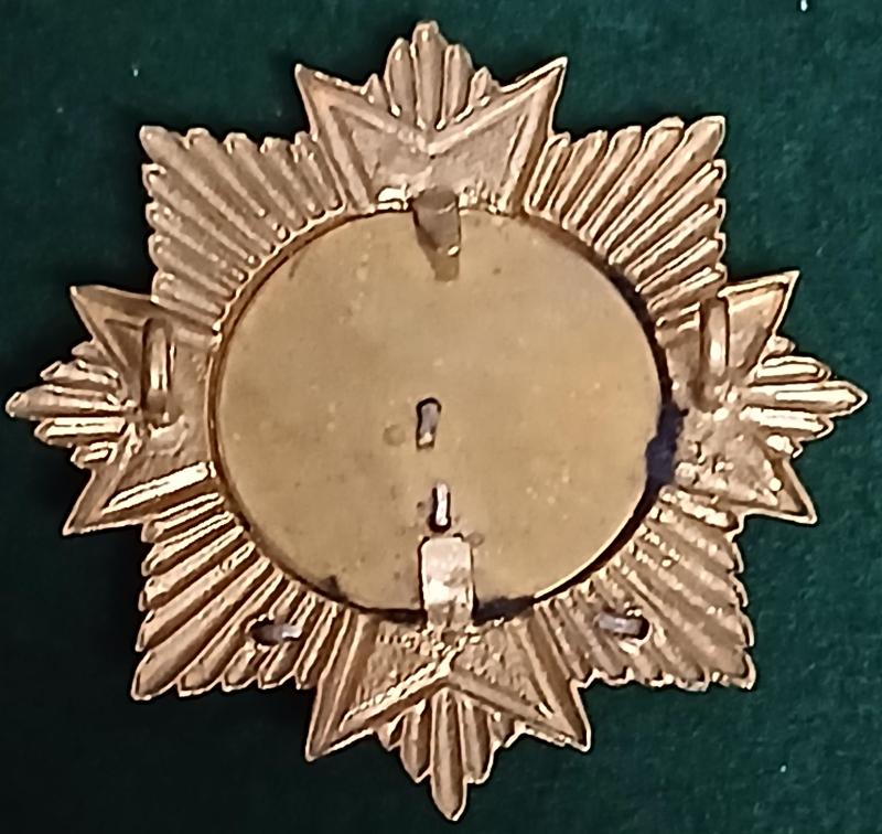 A gilt metal a Maltese cross upon an eight pointed star. On the Cross the Garter with motto; within the garter a Hart crossing a ford in silver, A silver scroll inscribed “Bedfordshire” below the Garter.