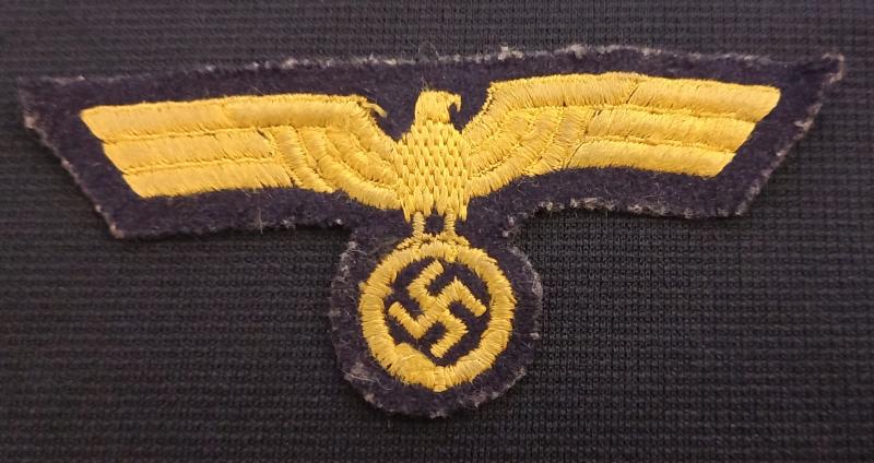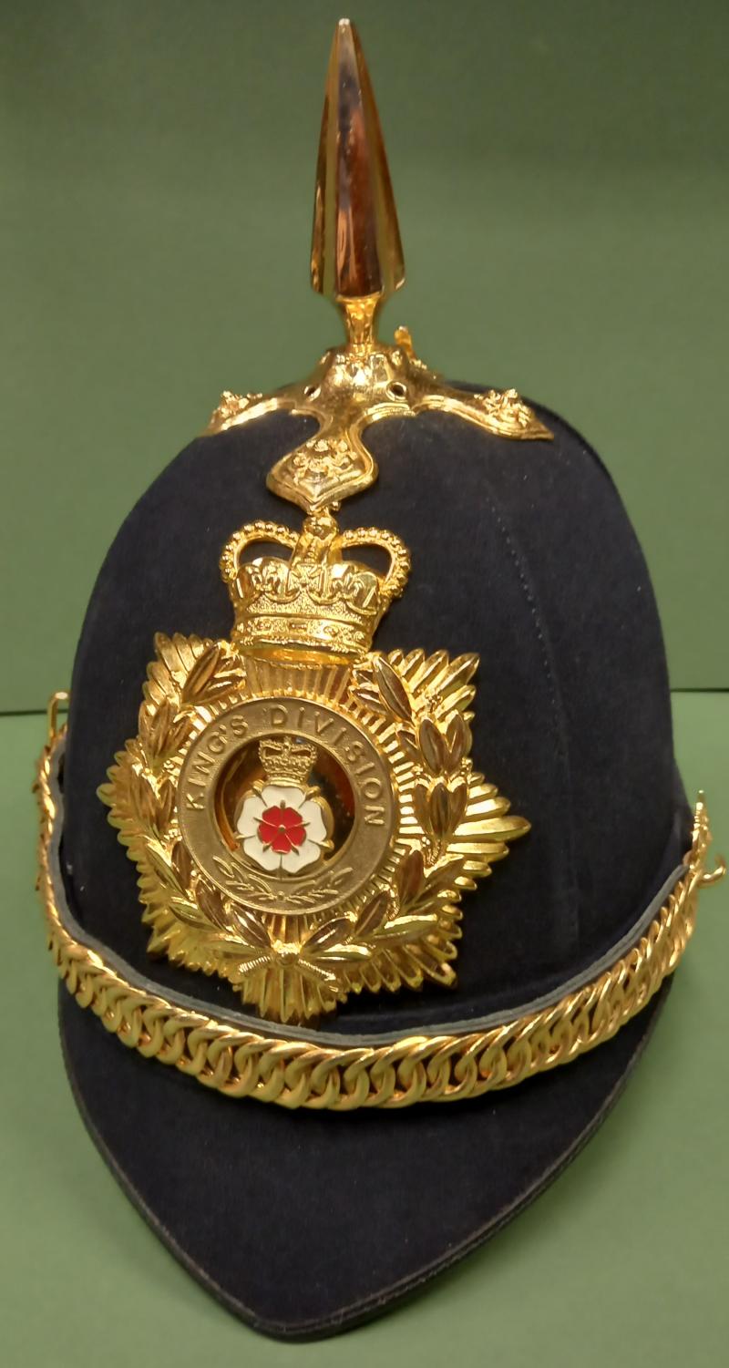 Black felt, four panel crown with rounded peak and rear brim. Leather edging. Gilt oak leaf crown mount with gilt spike. Brass Artillery side mounts. Brass eagle Artillery plate with central white metal electrical flashes. Leather sweatband. Crown with 1900 Inspection stamp. read more